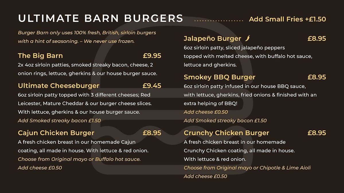 The Burger Barn menu is a blend of classic comfort and contemporary innovation. It features a range of premium burgers, each prepared with fresh ingredients and cooked to perfection. The Beef Barn, a standout favorite, boasts a juicy patty, melted cheese, and flavorful sauces that make every bite a satisfying experience. For those looking for something lighter, the Veggie Barn offers a hearty, flavorful plant-based burger that doesn’t compromise on taste or texture.